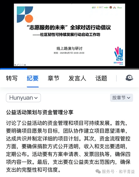 线上工作坊:干货赋能可持续发展 - 娄老师:强调公益资金是“使命货币”,需以 “愿景-目标-预算”三角闭环管控,守护初心。 - 赵老师:分享“翕宝涅槃计划”——心智障碍者参与国潮设计,实现就业与品牌造血,为“公益+商业”提供范本。 - 圆桌讨论: ▶ 林长波:从志愿者圈层启动 “涟漪传播” ,提升项目知名度; ▶ 赵艳萍:公益市集需 “多元设计” ,覆盖全年龄层; ▶ 滕云:项目发展要 “迭代重于完美” ,在过程中找方向。 反馈与行动:听见需求,延续热忱 ● 我们的声音— √ 关于如何推进志愿服务、让志愿服务在可持续发展中发挥重要作用, √ 在未来的一年我们关注什么,还可以做些什么 一、创新招募与参与渠道拓展 说明:突破传统模式,借助短视频、社交媒体等年轻化平台,以更具吸引力的方式招募青年群体。针对学生、青少年、社会人士等不同目标人群,设计精准的参与渠道,同时加强多元化招募与服务需求的精准匹配,提升志愿服务效率与参与者成就感,让更多人以纯粹的奉献初心加入志愿服务。