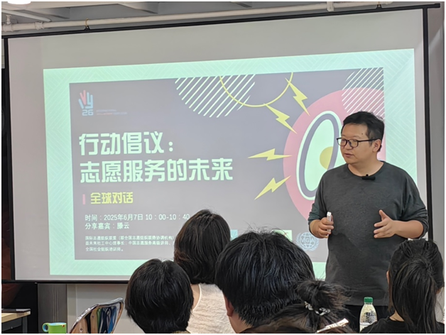 青益社工中心滕云理事长介绍本次对话由5个国际单位发起,成果将形成报告提交国际平台,为2026国际志愿年献策。